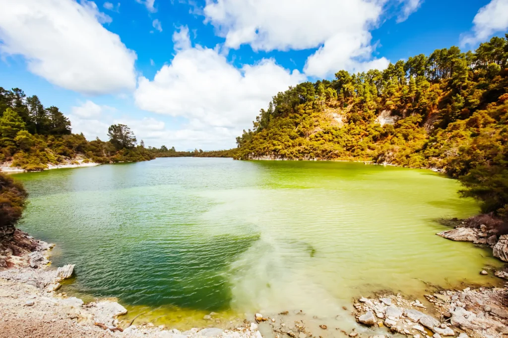 Desayuno. Visitaremos los puntos destacados de Rotorua City Sightseeing: Lago Rotorua, Bosque de Secoyas y Jardines Gubernamentales.